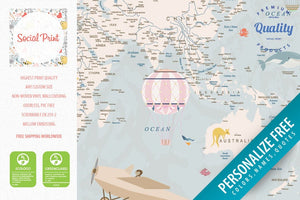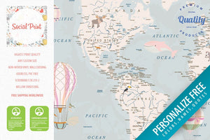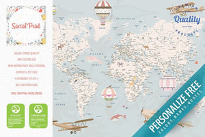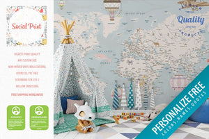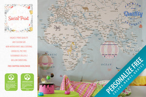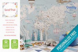 Highly Detailed World Map Wallpaper for Girls Room with Hot Air Balloons, Planes, Animals, Countries & Cities, Nursery Wallpaper / Non-Woven wall coverings