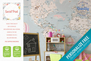 Decorate your kids room walls with this unique highly detailed world map wallpaper. Educational world map wallpaper for girls or boys nursery. Let you child educate while growing. Learn Countries, Cities, Rivers, Lakes, Islands etc.