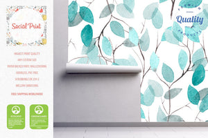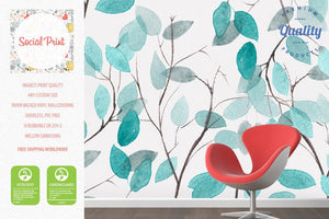 Turquoise Leafs Watercolor Wallpaper/Non-Woven Wall Coverings