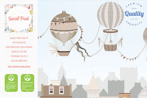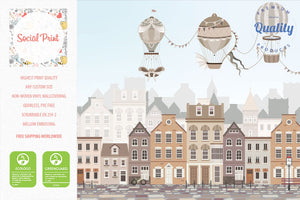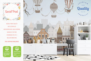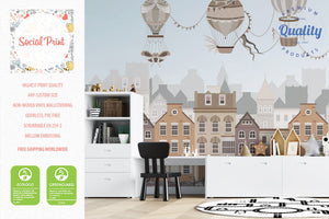 Retro Houses City Wallpaper and Hot Air Balloons, Nursery Wallpaper / Non-Woven wall coverings
