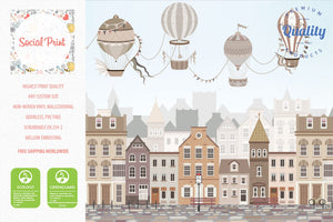 Vintage Houses City Wallpaper with Hot Air Balloons for Nursery, Kids Room Wallpaper